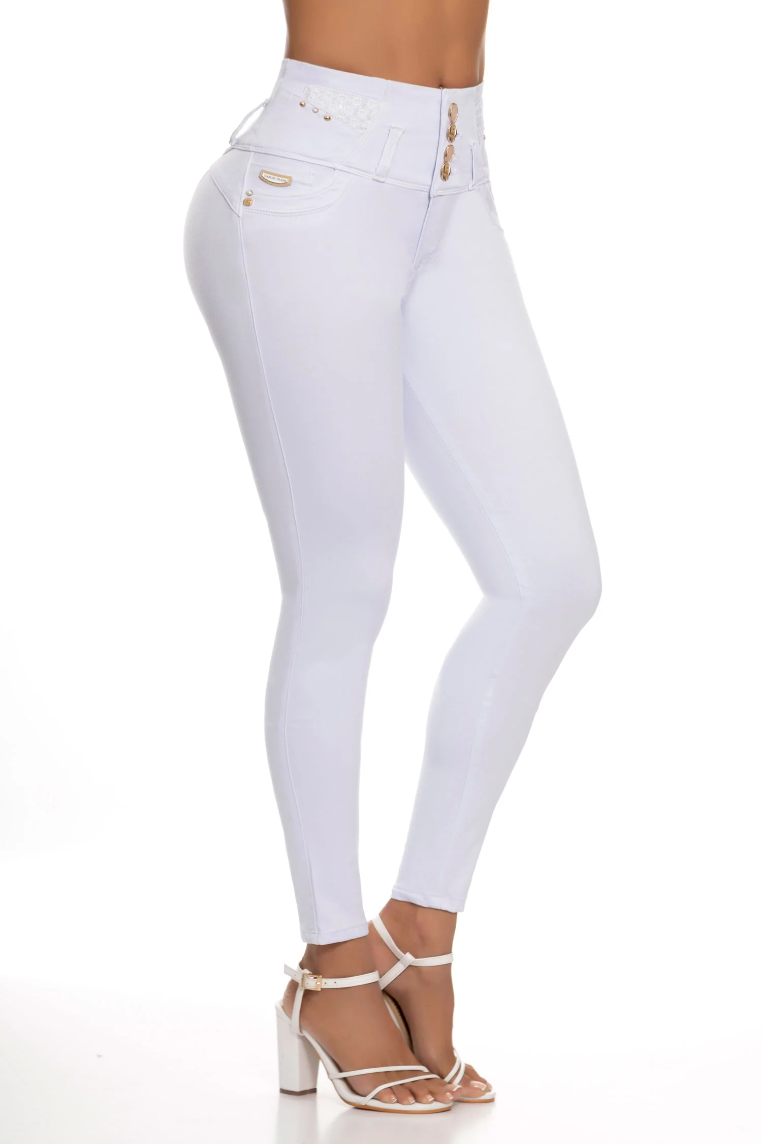 Jean bota skinny, con pretina ancha, de cuatro botones tiro medio, en color blanco, elaborado en índigo, sin bolsillos traseros, cuenta con el mejor confort y horma para resaltar tu figura.