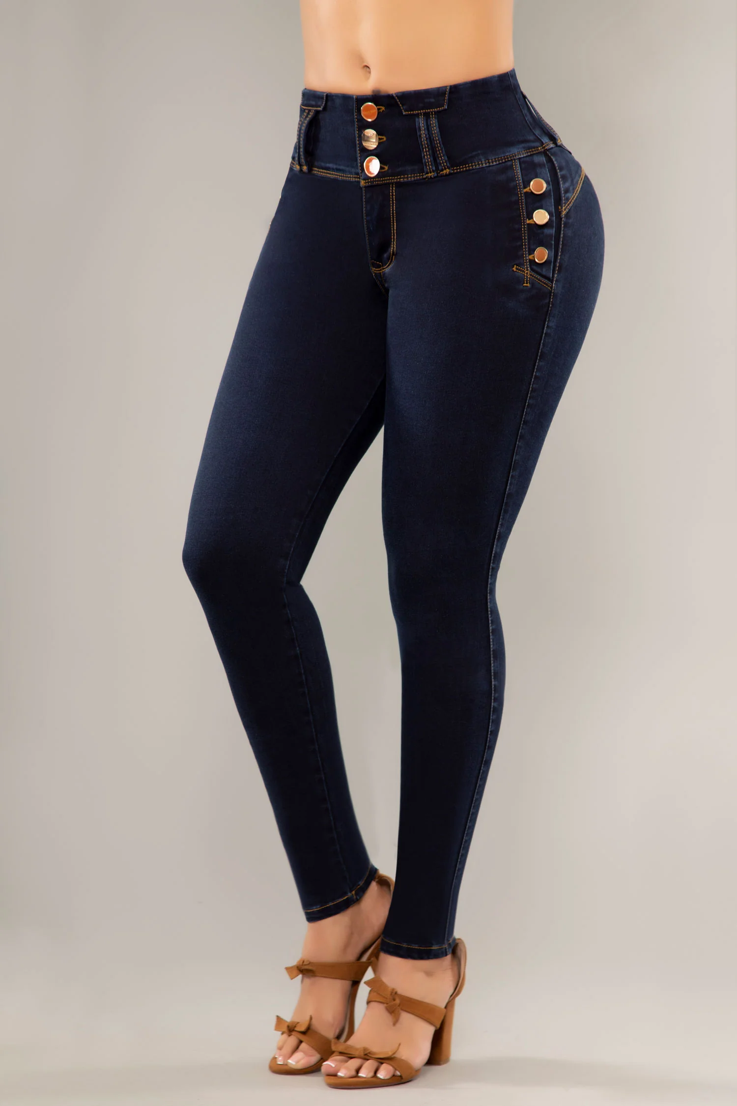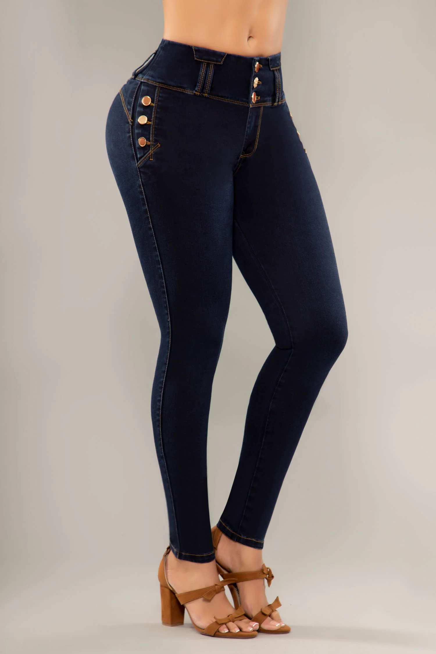 Jean bota skinny, con pretina ancha de tres botones, tiro alto, control abdomen, en color azul oscuro, elaborado en índigo, sin bolsillos traseros y con apliques básicos. Cuenta con el mejor confort y horma para resaltar tu figura.