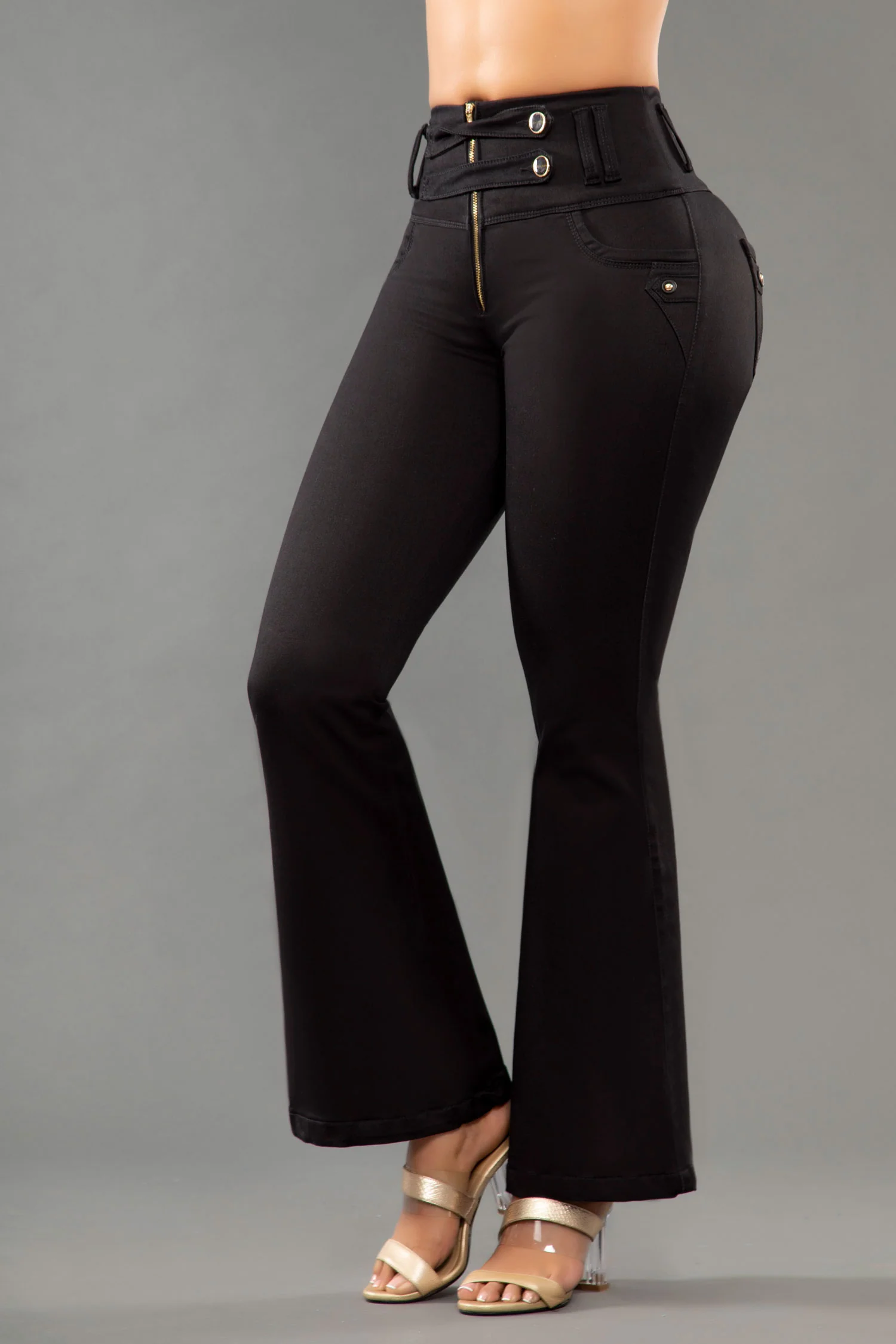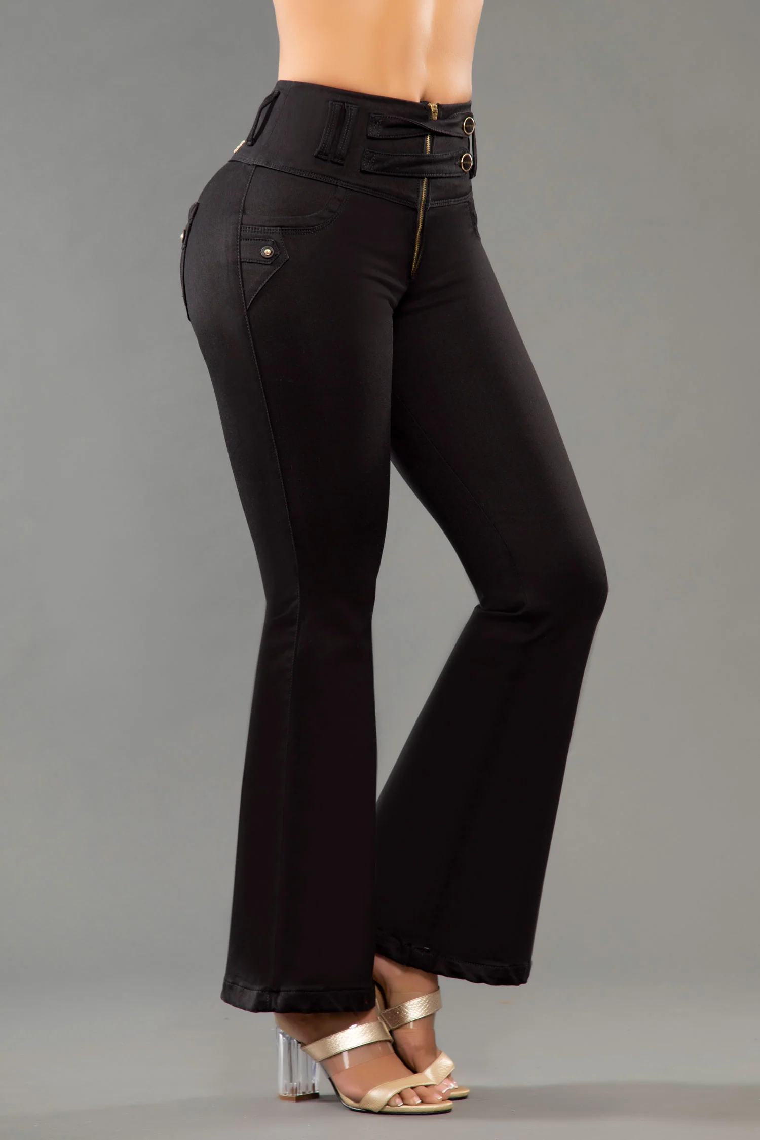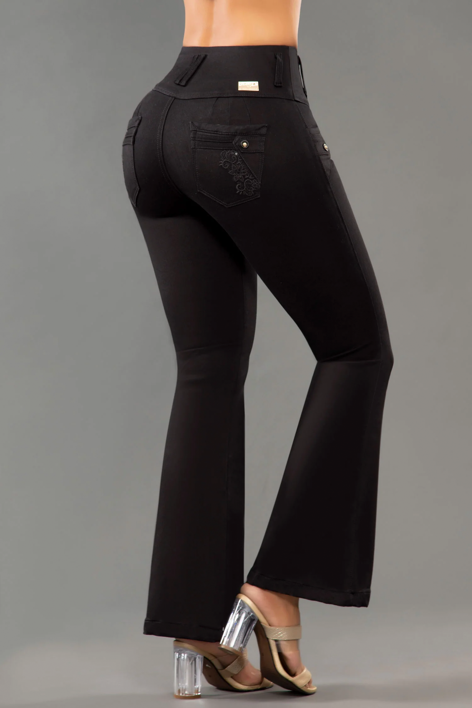 Jean bota campana, con cierre y tiro alto, en color negro, elaborado en índigo, con bolsillos traseros y cuenta con el mejor confort para lucir y sentirte siempre cómoda.