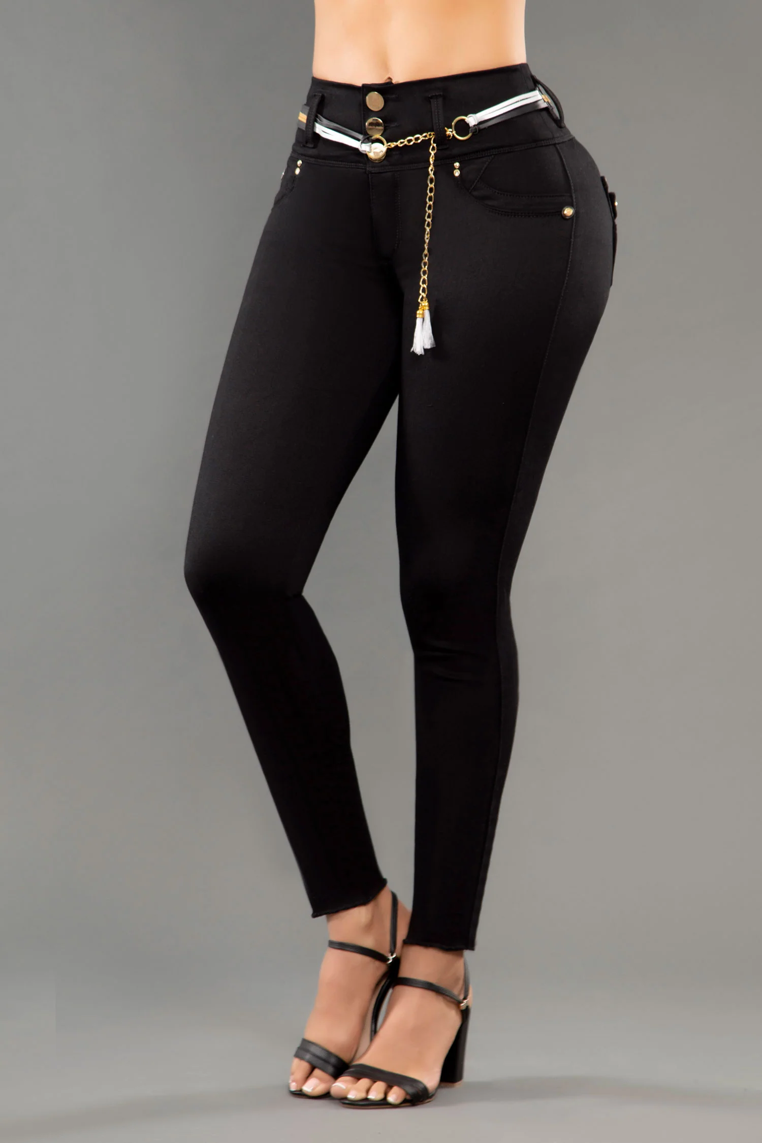 Jean bota skinny, con pretina ancha de tres botones, tiro alto, en color negro, elaborado en índigo con apliques decorativos, con bolsillos traseros. Con el mejor confort y horma para resaltar tu figura.
